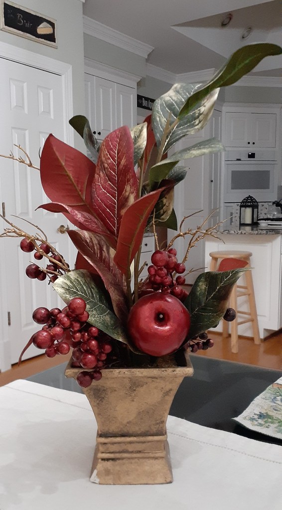 On my last visit I was headed out of the store when I noticed some Christmas decorations that appeared to be in good condition. I hadn’t purchased any in years, and decided we could use an additional piece or two. Among the items that caught my attention was a beautiful fruit/floral arrangement in an antiqued gold pot. It had deep burgundy apples and berries, and large green and burgundy leaves with gold brushed throughout.